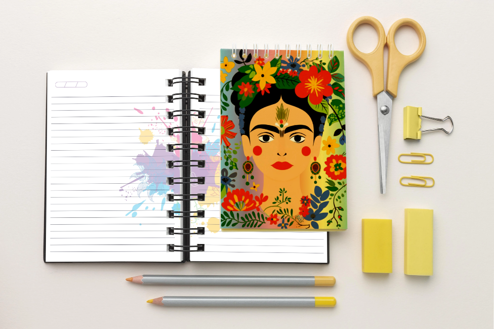 Colors of Frida notebook, school size, with pages that complement each other, with a blur of colors and elements that refer to the artist's life/work.